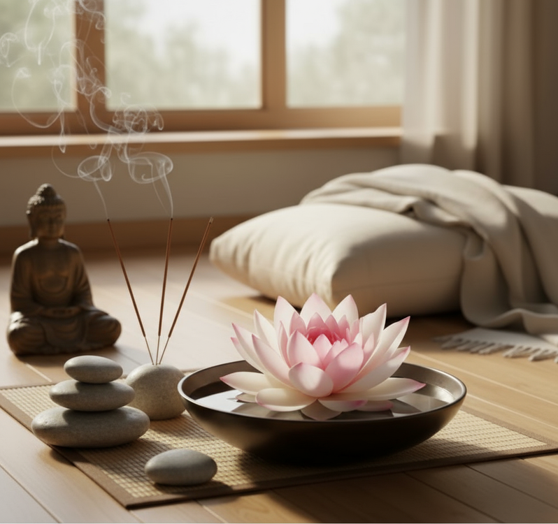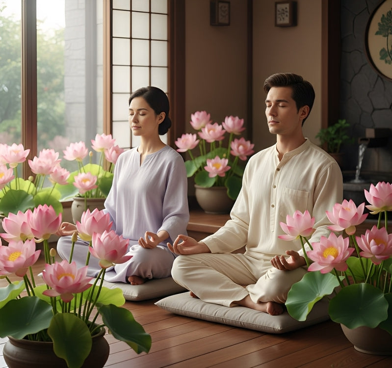 "Create your peaceful haven—enhance your meditation and relaxation rituals with the calming presence of blooming lotus flowers."